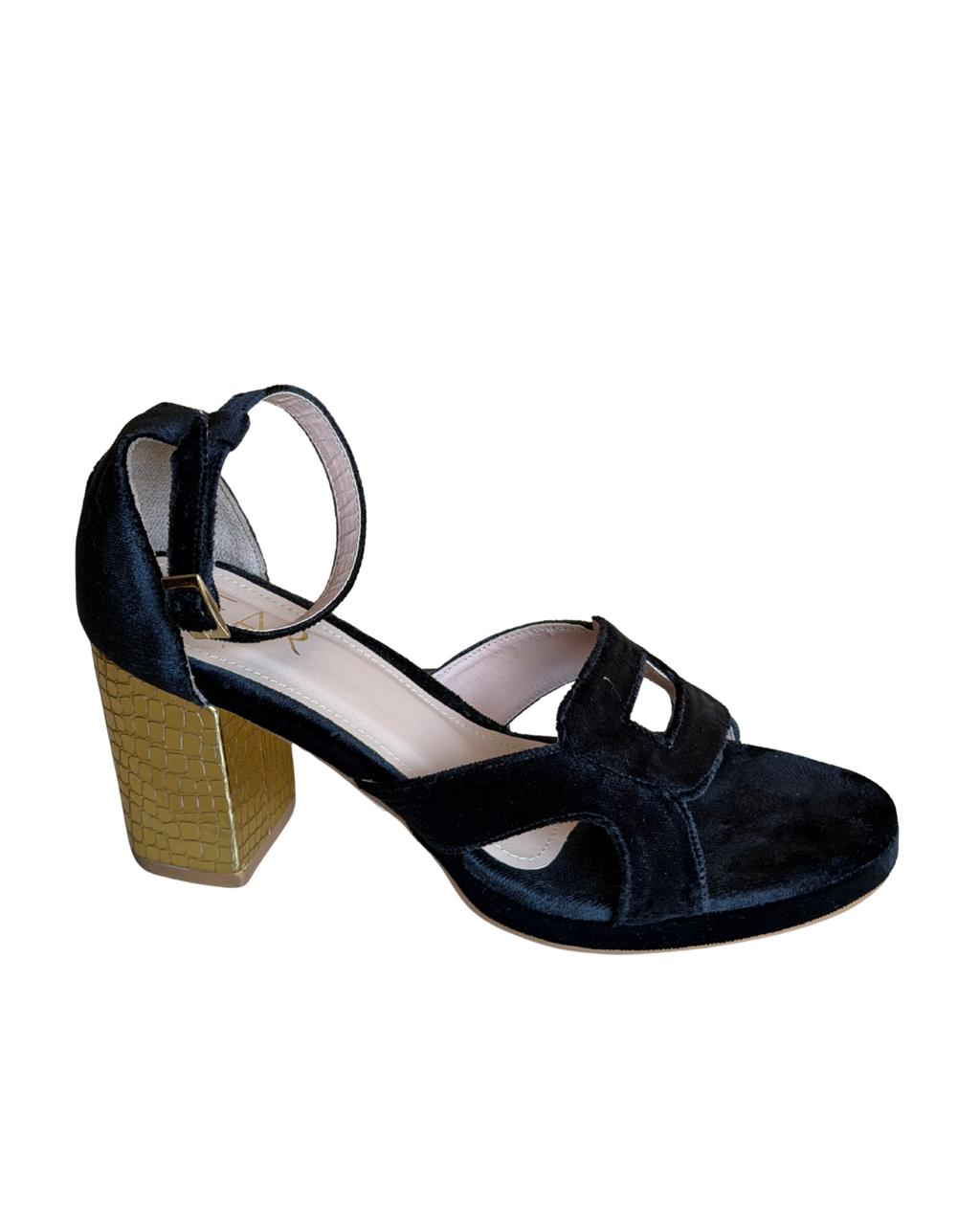 Tacón 8 cm con plataforma de forma geométrica en la parte delantera, con un tacón dorado texturizado.